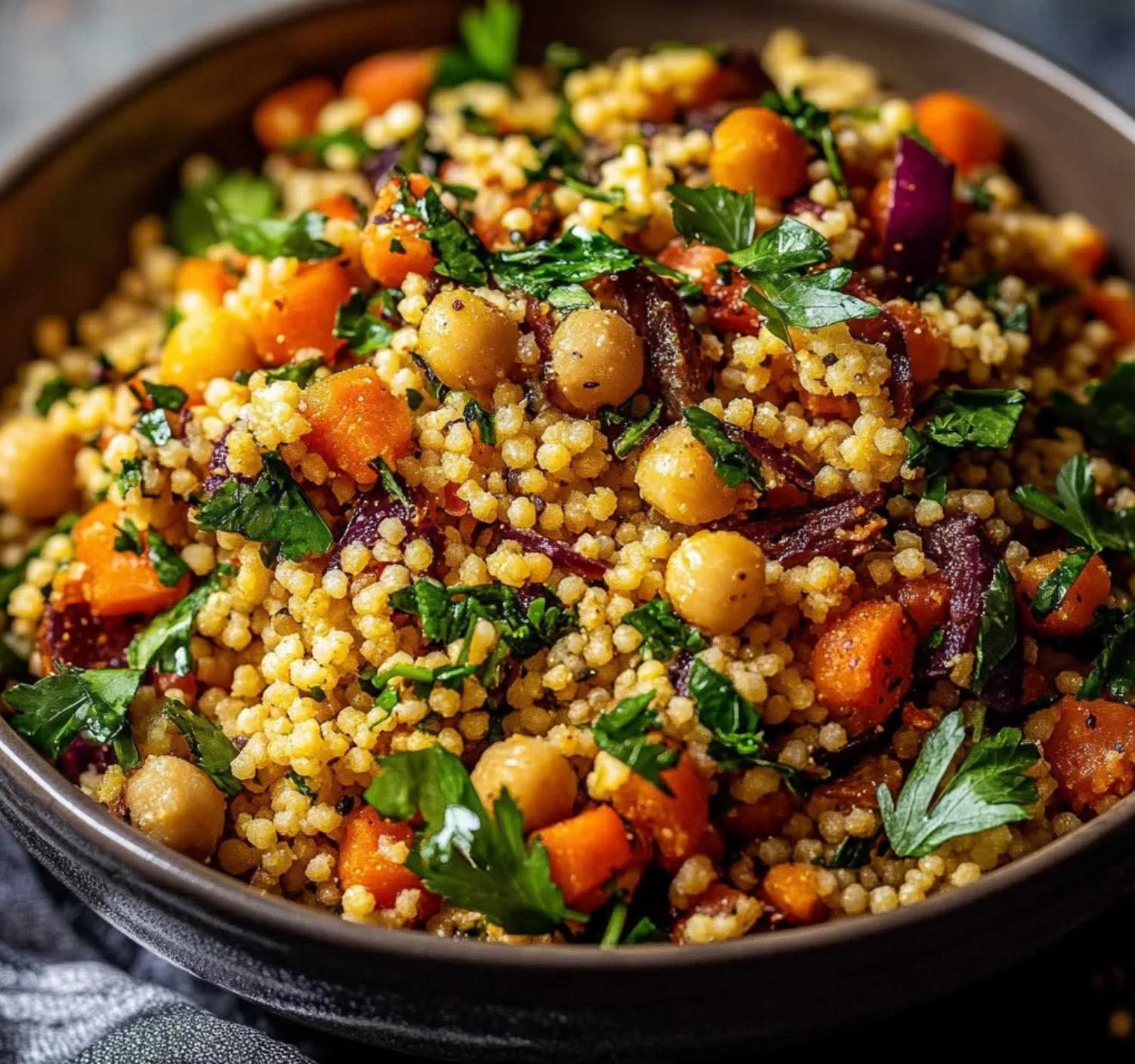 Salade de couscous perlé aux pois chiche et carottes épicée à la marocaine.